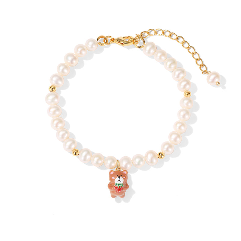• Lustrous pearls strung into a chain are like crushed moonlight around the wrist. The bear pendant holding a strawberry is charmingly naive, as if hiding sweet whispers, and the golden beads add more agility.