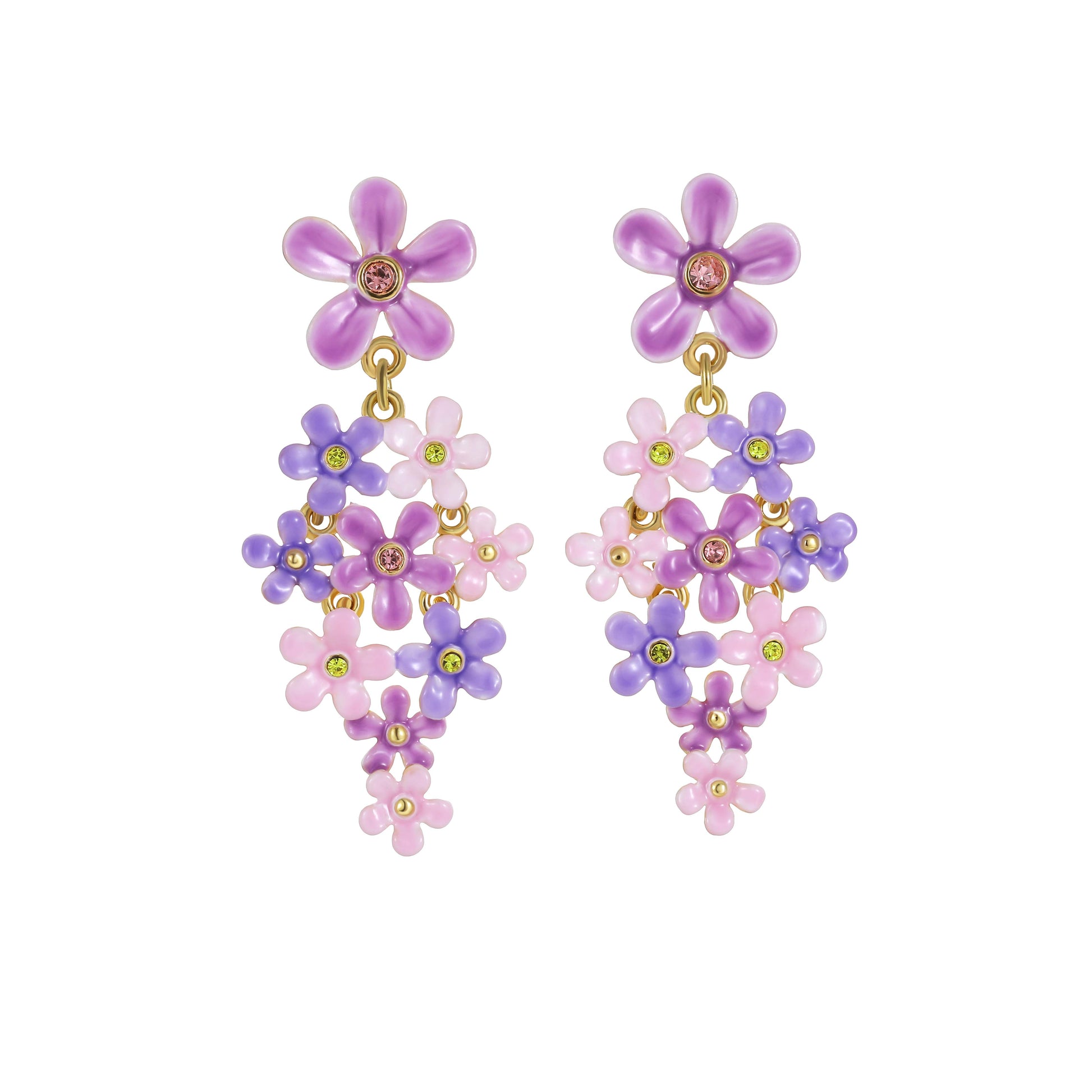 • These enchanting earrings feature cascading clusters of pastel pink and lavender blossoms, anchored by a bold flower stud. Each delicate flower sparkles with golden accents and shimmering centers, evoking the gentle charm of rain drifting through a garden.